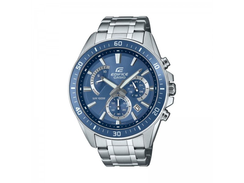 Stílusos és megbízható Casio Edifice férfi karóra, ezüst nemesacél tokkal és kék analóg számlappal. Fokozottan vízálló, naptár és stopper funkcióval, ideális választás mindennapi viseletre és sportoláshoz.