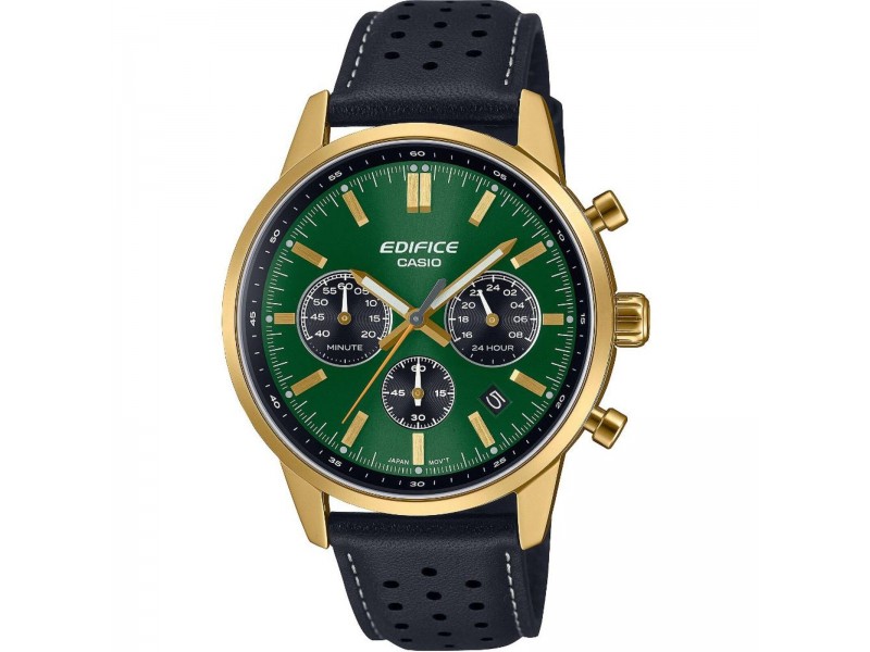 Casio Edifice EFR-575CL-3AEF: elegáns férfi karóra nemesacél tokkal és bőrszíjjal. Analóg zöld számlap, kristályüveg, stopper és naptár funkcióval. Fokozottan vízálló kialakítás, ideális mindennapi viselethez.