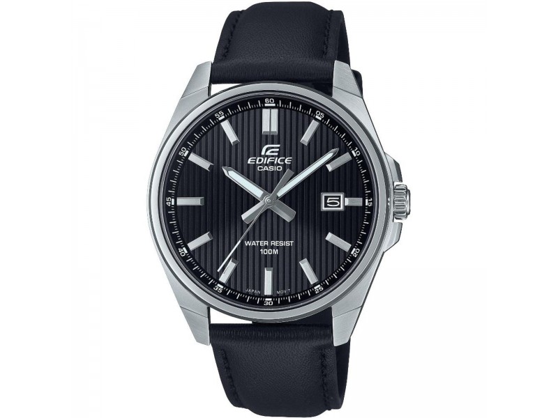 Casio Edifice EFV-150L-1AVUEF: elegáns férfi karóra nemesacél tokkal és fekete bőrszíjjal. Tökéletes választás mindennapi viselethez, vízálló kialakítása úszáshoz is ideális.