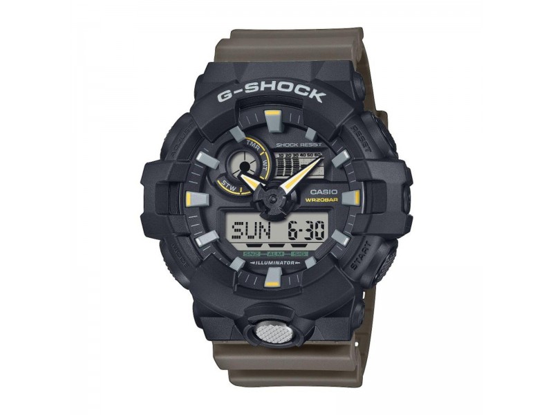 Casio GA-710TU-1A3ER G-Shock: Stílusos férfi karóra, amely ötvözi az analóg és digitális kijelző előnyeit. Vízálló, robusztus műanyag kivitelben, barna szíjjal. Ideális választás aktív életmódhoz, extra funkciókkal, mint a stopper és a világidő.