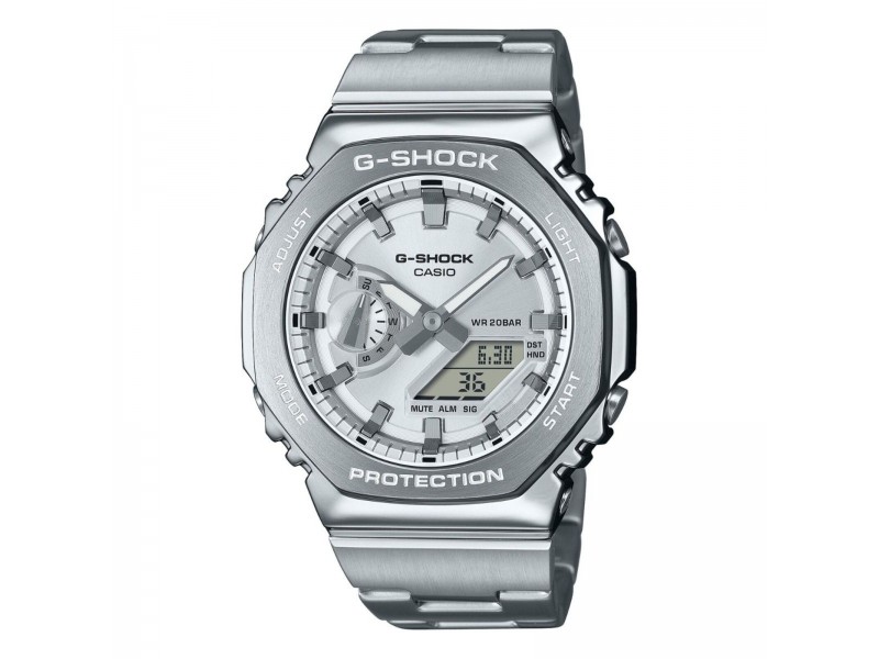 Casio GM-2110D-7AER G-Shock karóra: elegáns és strapabíró társ a mindennapokra. Ezüst acél tokozás, analóg-digitális számlap, kristályüveg és extrém vízállóság. Ideális választás a stílusos funkcionalitás kedvelőinek.