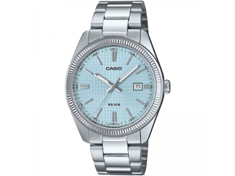 Casio MTP-1302PE-2AVEF: elegáns férfi analóg karóra kék számlappal, ezüst nemesacél tokkal. Alapszintű vízállóság és naptár funkció. Ideális választás a stílusos és praktikus időmérő eszközt keresőknek.