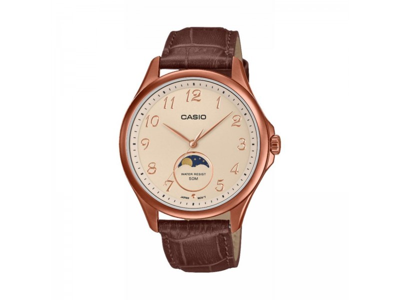 Casio MTP-M110RL-5AVER: Elegáns férfi analóg karóra rozsdamentes acél tokkal és barna bőrszíjjal. A rózsaarany tok és arany számlap exkluzív megjelenést biztosít, míg a kristályüveg tartósságot ad. Alapszintű vízállósággal és holdfázis funkcióval.