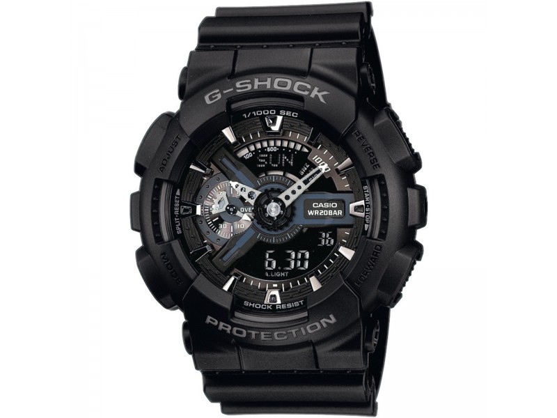 Casio GA-110-1BER: Robusztus G-Shock férfi karóra fekete műanyagból, 20 bar vízállósággal és kombinált kijelzővel. Tökéletes választás a sportos, mégis elegáns megjelenéshez.