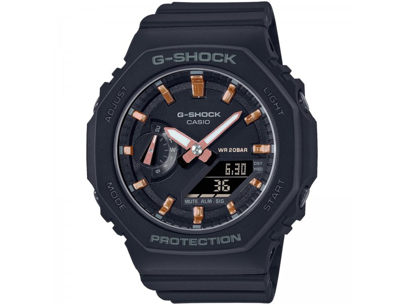 Casio GMA-S2100-1AER: Stílusos és strapabíró női karóra, amely a G-Shock kollekció ikonikus fekete dizájnját kínálja. Vízállósága 20 bar, így minden kalandra készen áll.