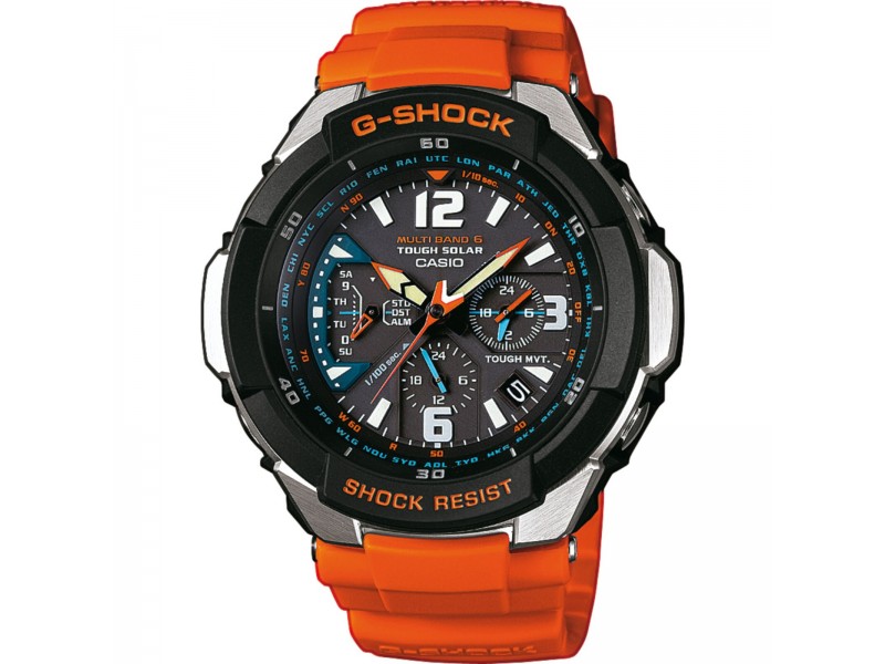 Casio GW-3000M-4AER: Férfi analóg karóra, amely fényenergiával működik és extrém vízállóságot kínál. Narancssárga műanyagszíj, ezüst acél-műanyag tok, barnás számlap. Stílusos választás, amely megbízhatóan kísér kalandjaid során.