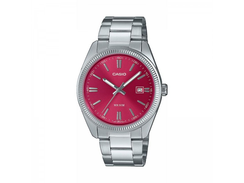 Casio MTP-1302PD-4AVEF: Elegáns férfi karóra piros számlappal és ezüst nemesacél szíjjal. Kristályüveggel és alap vízállósággal ideális mindennapi viseletre.