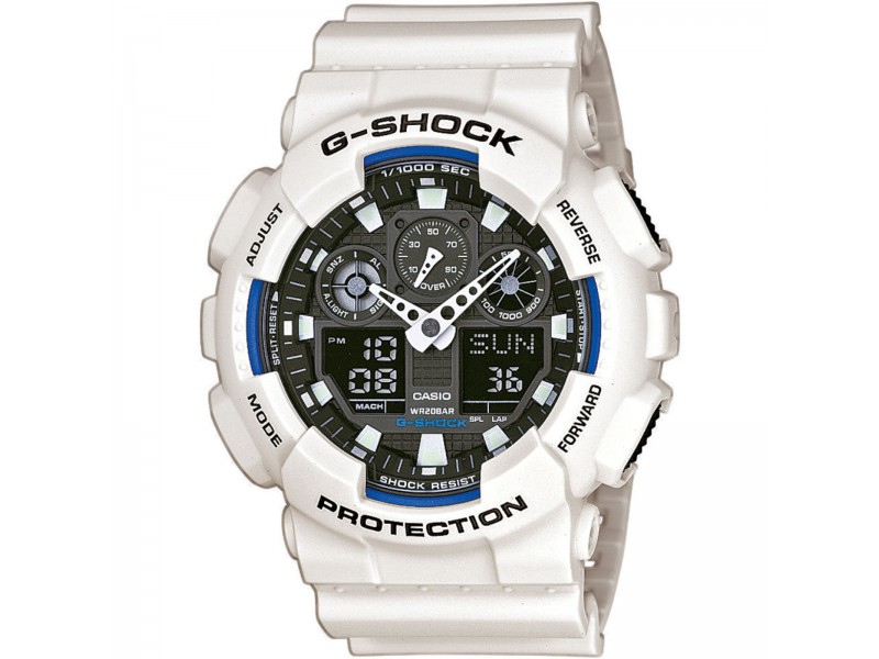 Casio GA-100B-7AER: Stílusos és strapabíró G-Shock karóra, mely ötvözi az analóg-digitális kijelzőt. Fehér műanyag tokja és 20 bar vízállósága tökéletes választássá teszi aktív életmódhoz.