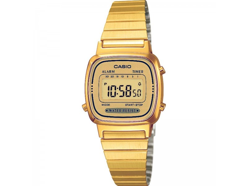 Casio LA670WEGA-9EF: Elegáns vintage női digitális karóra aranyozott nemesacél szíjjal. Kompakt, cseppálló design, praktikus funkciókkal – naptár, stopper, ébresztő – tökéletes mindennapi társ.