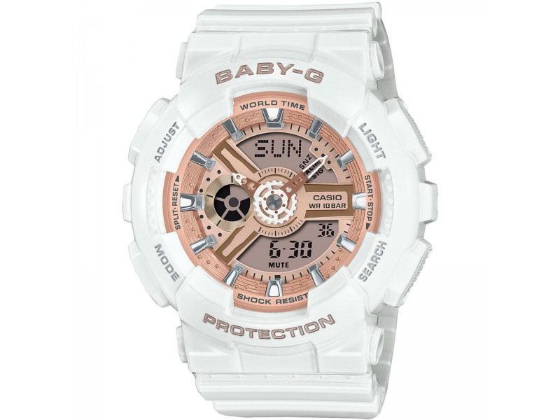 Casio Baby-G BA-110X-7A1ER: Stílusos és praktikus női karóra, arany számlappal és kristályüveggel. Fokozott vízállóság, LED világítás és világidő funkciók teszik tökéletes társsá minden kalandhoz.