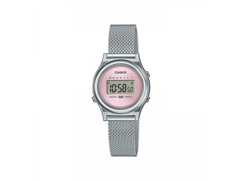 Casio LA700WEM-4AEF: Elegáns női digitális karóra vintage stílusban. Ezüst nemesacél szíjjal, rózsaszín számlappal és praktikus funkciókkal, mint naptár és ébresztő. Cseppálló kialakítás a mindennapi használatra.
