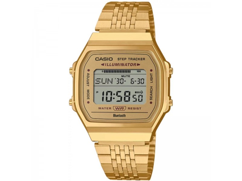 Casio ABL-100WEG-9AEF: Stílusos unisex vintage karóra, arany színű nemesacél csattal. Digitális kijelző, bluetooth funkció és lépésszámláló teszi modernné. Cseppálló kialakítás, LED világítás és többfunkciós naptár.