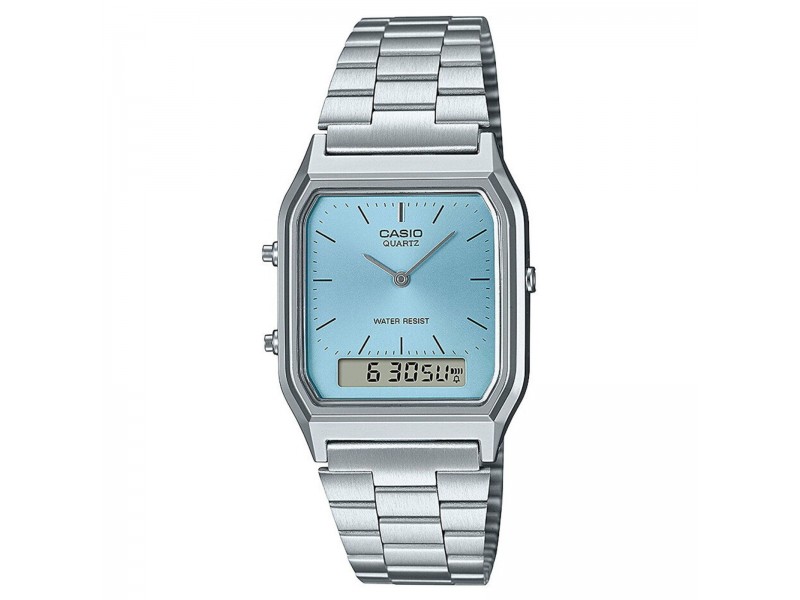 Casio AQ-230A-2A1MQYES Vintage unisex karóra: Elegáns analóg-digitális dizájn kék számlappal és nemesacél szíjjal. Cseppálló, naptáras, ébresztős óra időzóna funkcióval – tökéletes választás stílusos időméréshez.