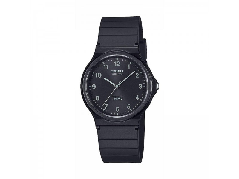 Casio MQ-24B-1BEF: Elegáns unisex analóg karóra minimalista stílusban. Fekete műanyag tok és szíj, cseppálló kivitel, arab számos fekete számlap. Ideális választás mindennapi viselésre.