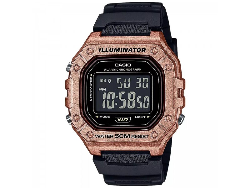 Casio W-218HM-5BVEF: Stílusos unisex digitális karóra rózsaarany műanyag tokkal és fekete számlappal. Praktikus funkciók: naptár, stopper, ébresztő és háttérvilágítás. Alapszinten vízálló, így ideális mindennapi viseletre.